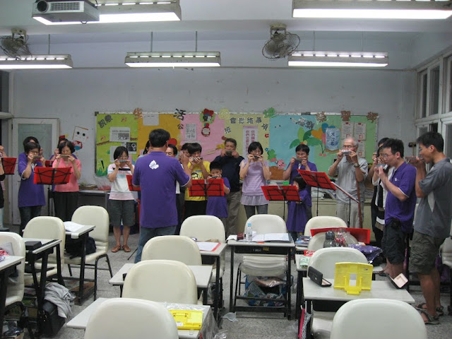 經過惠美姐與蘇爺爺的幫助,我們順利租到頭份國民黨部地下室的空間,等於是無接縫的延續原有的課程,而且老師還特地加碼十孔的課程!!不過由於我們在8/25要上獅頭山作休閒演出,所以今天老師特地搬了音響過來實際操作一番,希望屆時不要漏氣了!!