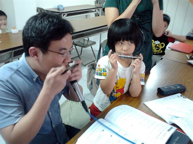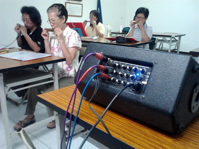經過惠美姐與蘇爺爺的幫助,我們順利租到頭份國民黨部地下室的空間,等於是無接縫的延續原有的課程,而且老師還特地加碼十孔的課程!!不過由於我們在8/25要上獅頭山作休閒演出,所以今天老師特地搬了音響過來實際操作一番,希望屆時不要漏氣了!!