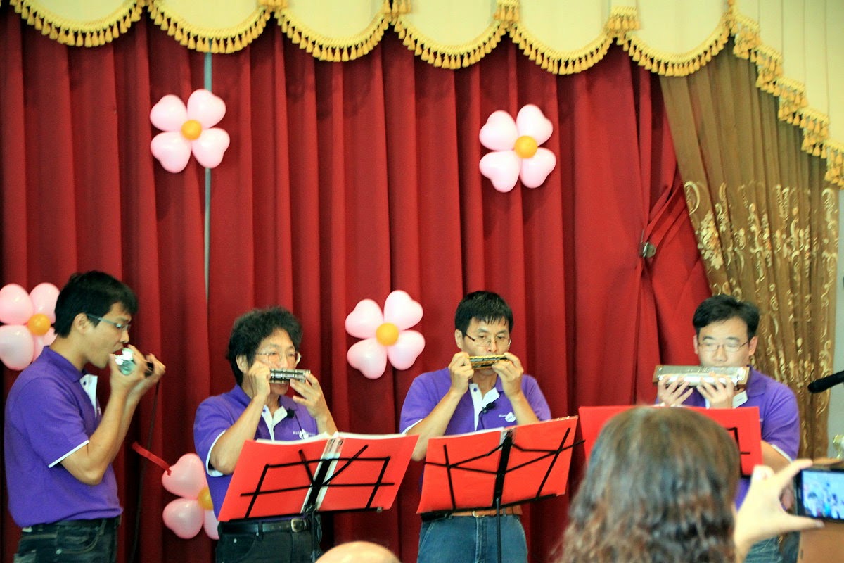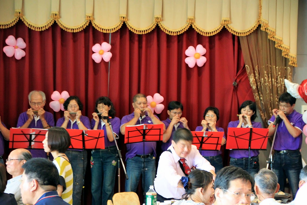 因為舞臺比較小,所以老師將演出隊伍拆成AB兩團,這樣的設計也可讓表演者有充份的休息及準備時間!!用卡拉帶來伴奏,一直是咱們表演的標準型態,這次的選曲也都偏向愛情,祝福之類的,希望能討好在座貴賓與主人家的心!!大約在12點45分左右,A團終於登台演出,第一首"婚禮的祝福"揭開序幕,只見在座來賓貴客們一邊熱情的用餐,一邊愉悅的欣賞口琴的表演!!