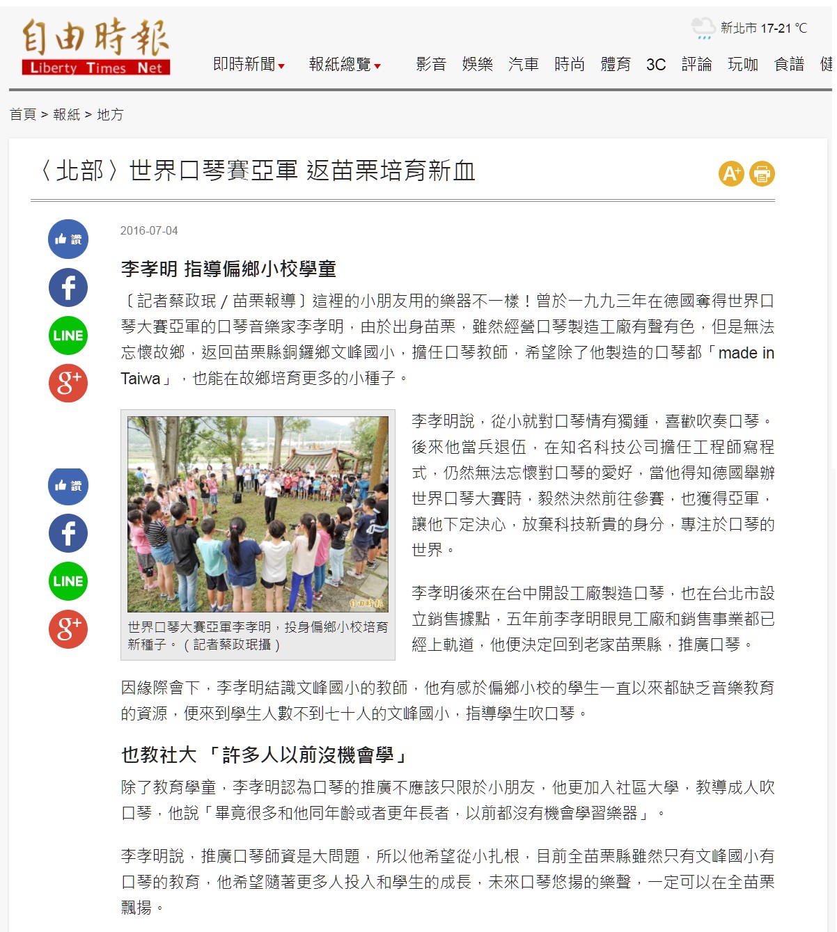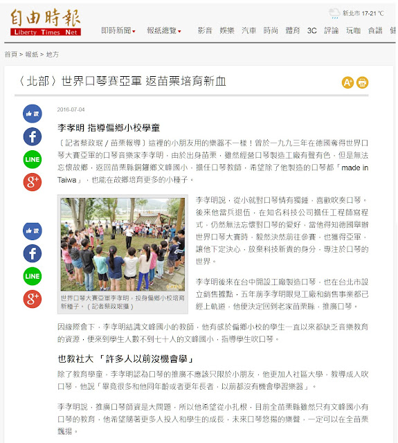 [媒體報導] 世界口琴賽亞軍 返苗栗培育新血